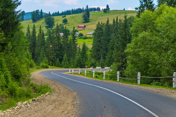 asphalt road with a dividing strip going between green trees against a background of a slope with houses