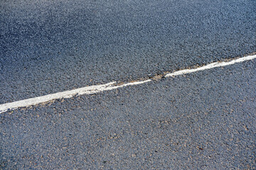 The dividing strip of an asphalt country road. White road markings.