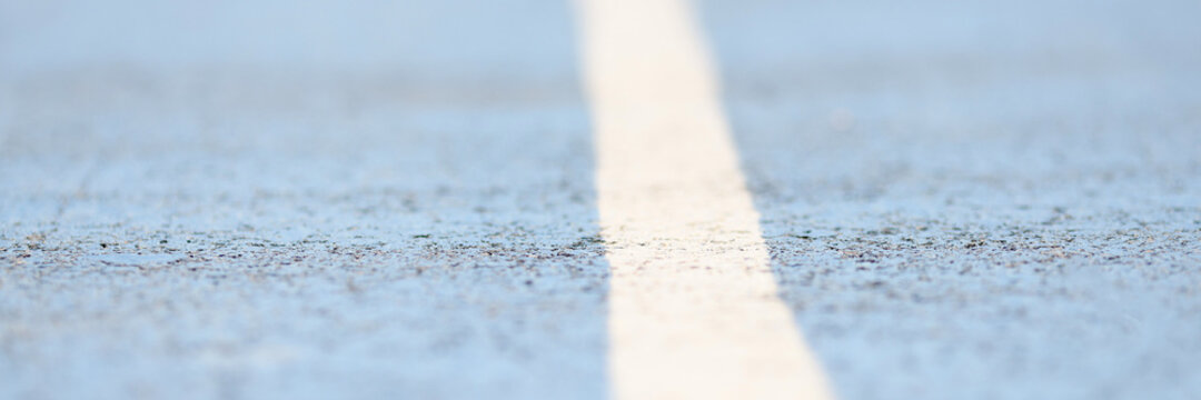 Level asphalted road with a dividing white stripes. The texture of the tarmac, top view.