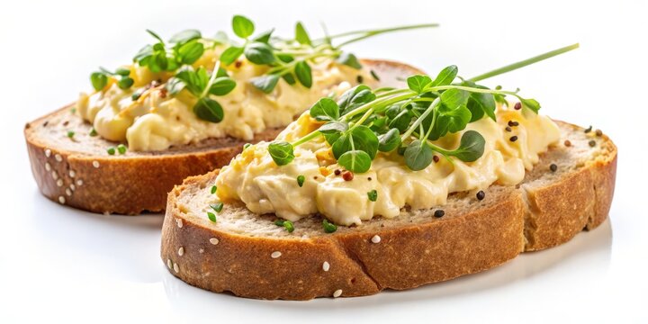 Moist and creamy egg salad peeking out from between two slices of crispy white bread, garnished with a sprinkle of fresh cress and a few sesame seeds, shot against a clean white background.