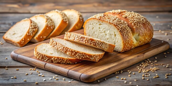 Crusty sesame seed bread slices arranged on a wooden board, with a few scattered sesame seeds on the surface
