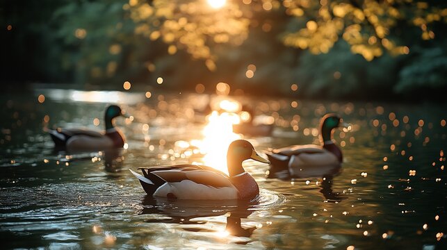 Serene sunrise on tranquil lake with ducks and water lilies
