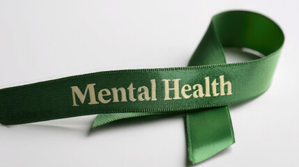 green ribbon in loop shape, symbol of fight against psychological problems, inscription "Mental health", psychology, may, mental health awareness month