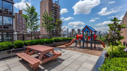 Family-Friendly Rooftop Terrace: children's play area, seating for adults, barbeque grills