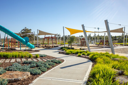 A well-designed public playground in suburban Australia, featuring large shade sails, and landscaped garden beds. Urban park design of public recreational facilities in a residential neighborhood