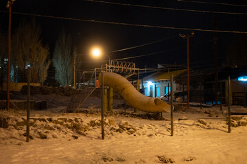 kids swinging on wicker swing on playground in park by lake, children's summer vacation with friends