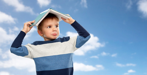 A child's hands holding a book over their head like a roof, space for caption. Books and children, selling books for kids, activities for children