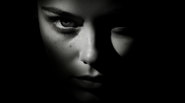A close-up of a model's face with sharp Halloween makeup and high-contrast lighting