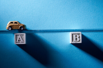 Male hand placing three wooden blocks with the letters of a b and c on yellow background.
