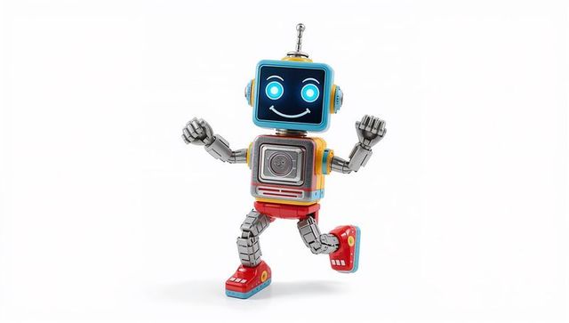 Studio shot of vintage robot toy standing by miniature shopping basket filled with electronic equipment