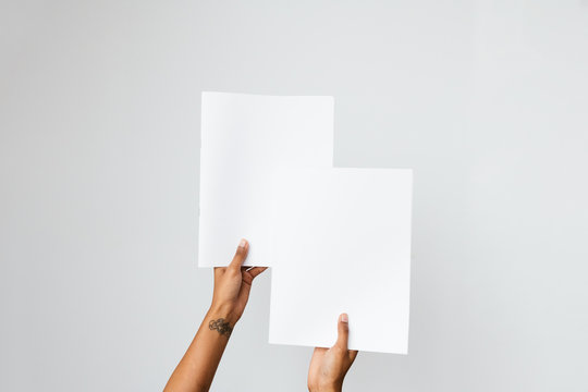 Hand holding a stack of blank white a4 size papers, ideal for showcasing flyers, documents, or presentation designs on a clean grey background