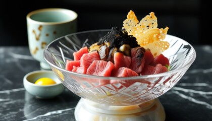 Gourmet poke bowl with seared a5 wagyu and caviar garnish, elegant dining presentation