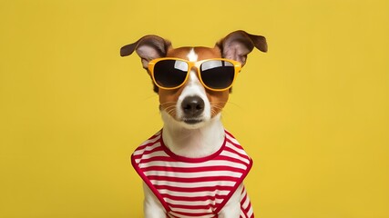 cute Dog Jack russell wear sunglasses and summer costume that looking at camera isolated on