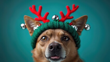 New Year and Christmas scenario with a Dog adorned in reindeer antlers headband set against a uniform background