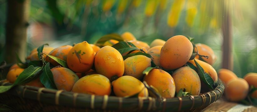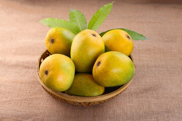 Indian Most popular Devgad Hapus Mango or Aamba in a basket isolated on Jute Background