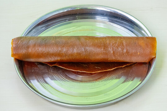 Aam papad is an Indian fruit leather made out of mango pulp mixed with concentrated sugar solution and sun-dried. It is also known as aamsotto, aamba sadhaa, ambyachi poli, manga thera, mamidi tandra.