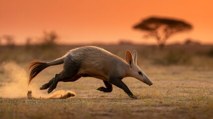 An aardvark in full stride across the African savanna, captured during the golden hour of sunset. Dust billows behind it as it runs