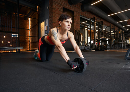 Focused female athlete using ab wheel in modern gym