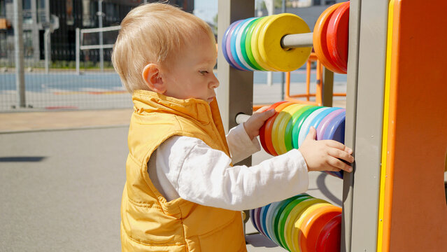 Cute baby boy playing with colorful abacus outdoors. Children developments, kids education, baby learning.