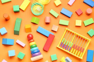 Baby kids toys frame. Colorful educational wooden plastic and fluffy toys for children on gray background. Top view, flat lay