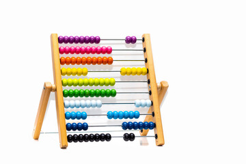 A multi-colored designer background enhances the vibrancy of a close-up wooden abacus on a white background, creating an engaging mathematics learning concept