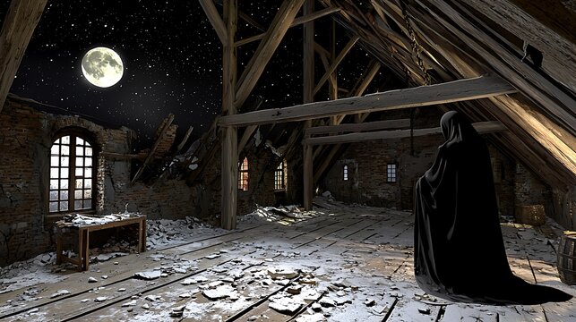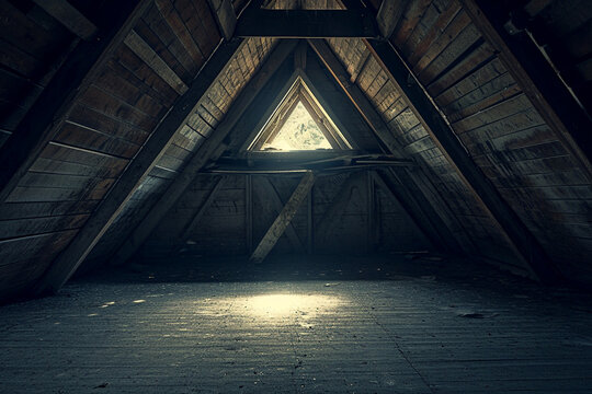 Dusty attic filled with forgotten boxes, cobwebs in corners