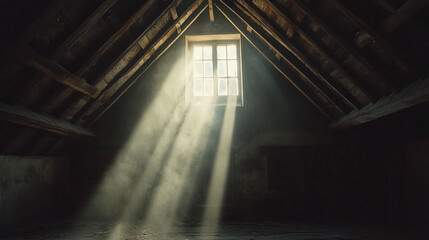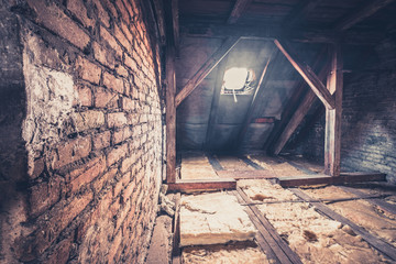 Window in old wooden attic of house under roof, view inside. Childhood fears, spooky haunted attic.
