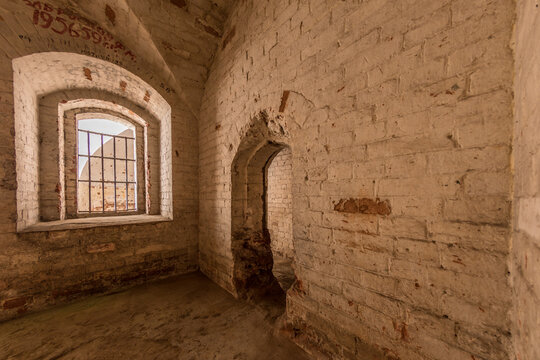 Eerie ruins of historic abandoned building with arched architecture