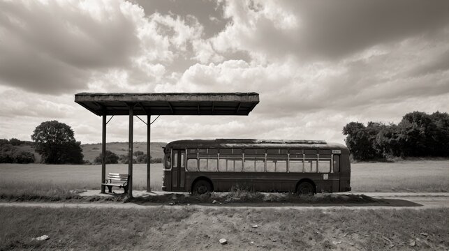 An old rusty bus stands snow-covered in a snowdrift. Apocalypse concept.