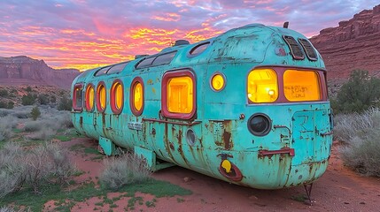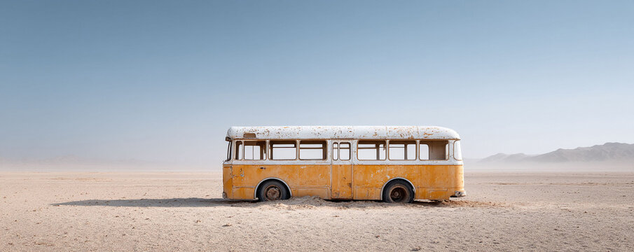 Surreal landscape featuring a weathered, yellow bus abandoned in a vast desert. Evokes themes of travel, isolation, resilience, and the passage of time.
