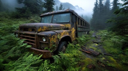 abandoned school bus sits amidst lush green ferns in a foggy forest. rusted vehicle, once vibrant, now blends into the overgrown surroundings, creating a haunting atmosphere