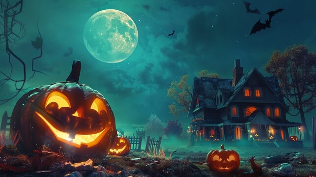 Old house with a Ghost in the forest at misty night or Night scene with House under moon. Old mystic building in dead tree forest.