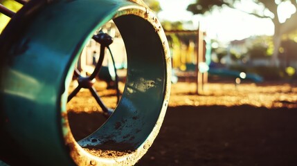 Close up of a weathered rusty metal tube on old playground equipment in a park with blurred background swings and structures
