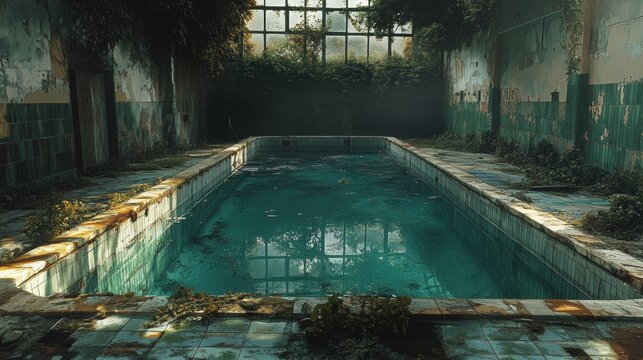Abandoned Pool Overrun by Nature, a forgotten space where weeds flourish in stagnant water, mirroring the decline of its surroundings