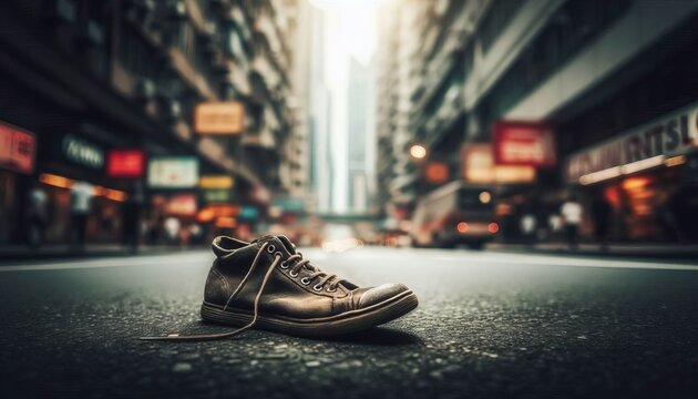 Abandoned shoes on a vacant street, symbolic of the journey halted by the harsh reality of broken dreams