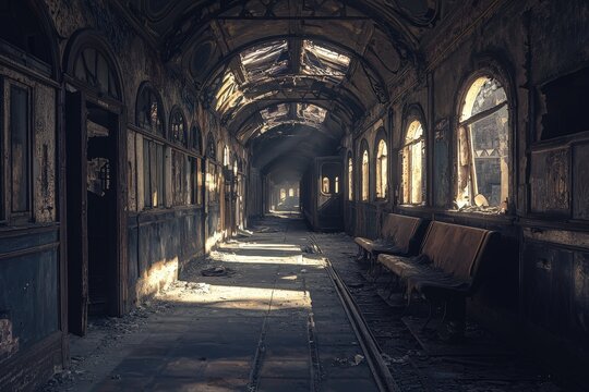 Overgrown railway station featuring a train, plants, and large glass roof with arched windows