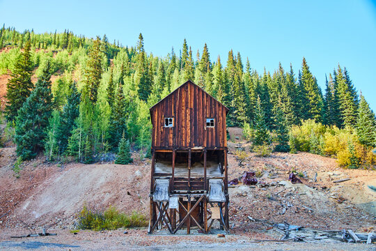 Rusted watchtower on rocky desert outcrop under clear sky after the apocalypse