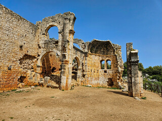 Abandoned bridge pier in tranquil blue sea under clear skies