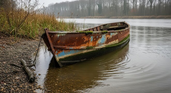 Tranquil waterscape featuring an old abandoned rusty boat moored by the bank amidst nature's calm