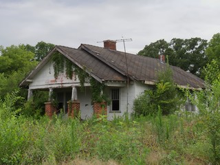 A dilapidated, abandoned house surrounded by shrubs and trees