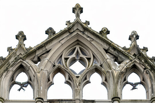 A close-up of an old Gothic window, its intricate tracery and weathered stone standing out starkly against a pure white background.