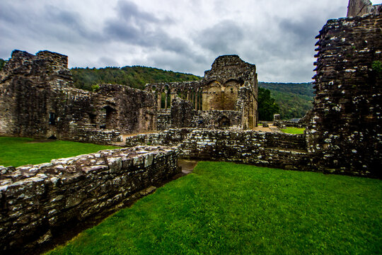 The ruins of Tintern Abbey in Wales in the early morning light on a stormy overcast day