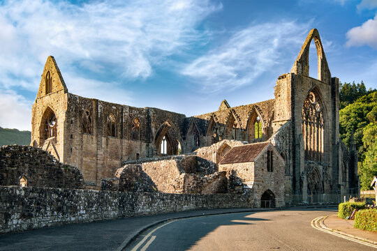 Tintern Abbey in the Wye Valley, Monmouthshire, Wales, UK. Cistercian Christian monastery founded 1131. Summer evening sunshine