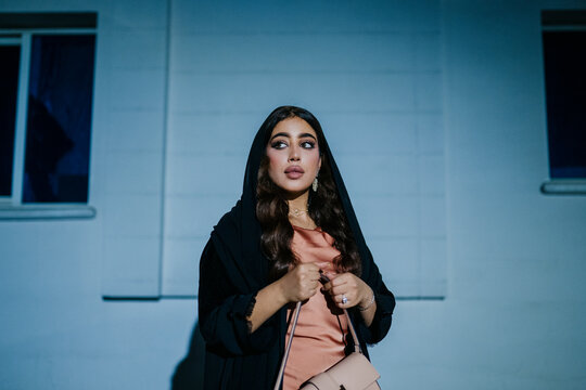 Elegant muslim woman wearing abaya and holding purse at night