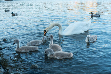 A group of young of Mute Swans  and an adult on the water - Cygnus olor at Abbotsbury Swannery, Dorset