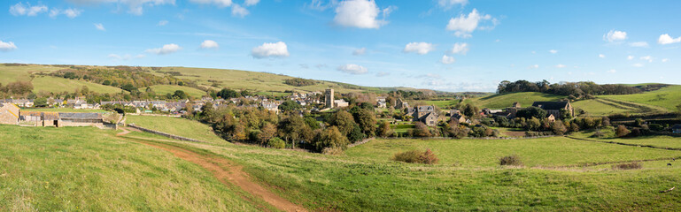 Panoramic view of Portand and Chesil Beach from the hill tops near Abbotsbury in Dorset, UK