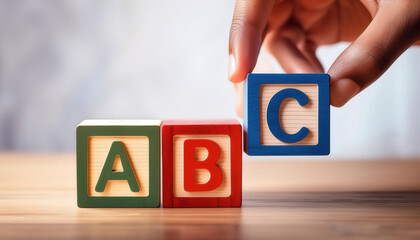 A hand is holding up blocks that spell out ABC