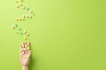 Learning alphabet with kids concept. High angle view photo of a toy wooden hand holding letter figures on isolated light green background with copyspace for text or promotional messages