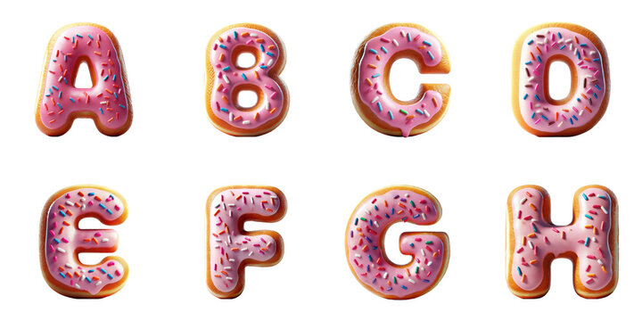 Alphabet Donut Letters A, B, C, D, E, F, G, H : Pink frosted donuts shaped as letters A to H with colorful sprinkles