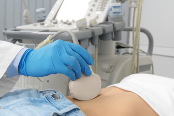 Ultrasound diagnostics of the stomach on the abdominal cavity of a girl in the clinic, close-up. The doctor holds the ultrasound probe over the patient's abdomen. Internal organs diagnostics.